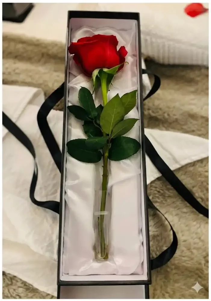 (Beautiful fresh rose presented in a black tied box with silk lining)